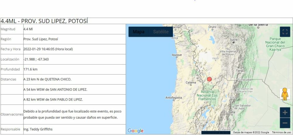 #ANF El Observatorio San Calixto registró este sábado un movimiento sísmico de 4.4 grados de magnitud, en la provincia Sud Lipez de #Potosí. Debido a la profundidad no se sintió ni causó daños en la superficie. https://t.co/1NefwjtH76