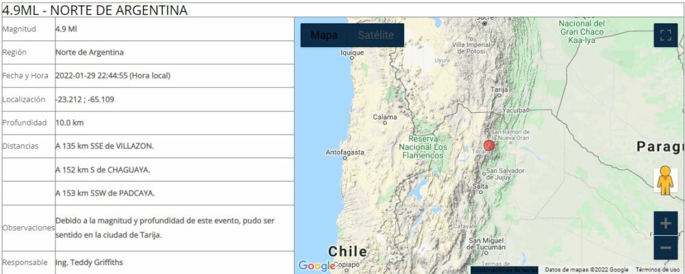 #ANF El Observatorio San Calixto registró un movimiento telúrico de 4,4 grados en la escala de Richter a las 22:44 de este sábado en la región de Humachaca en Jujuy #Argentina. El sismo se sintió en la capital tarijeña y otros poblados aledaños, como Padcaya y Chaguaya. pic.twitter.com/WvVEswsHim