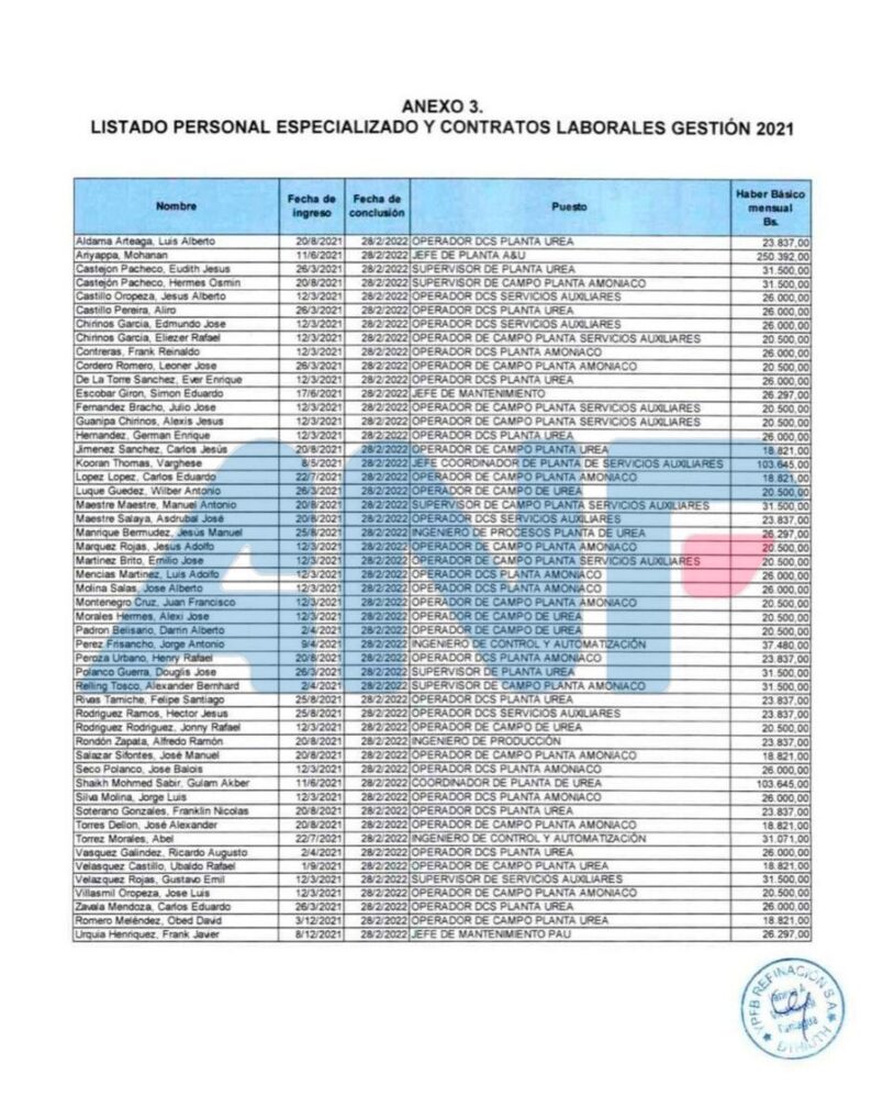 #ANF Conozca el haber básico mensual que recibe el personal especializado de la planta de Urea y Amoniaco, sueldos que oscilan entre Bs 250.000 y Bs 18.800, de acuerdo a información oficial.