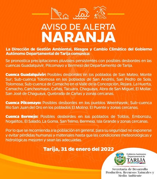 #Ultimo La Dirección de Gestión Ambiental, Riesgos y Cambio Climático de la gobernación de #Tarija emite una alerta naranja ante posibles desbordes de ríos en ese departamento. pic.twitter.com/4MdRz9E52q