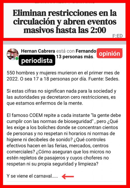 ENTRE COVID☣️, ECONOMÍA💲 Y CARNAVAL🎉 Las cifras de muertos por día en lo que va del año por el virus y la crítica del periodista Hernán Cabrera.