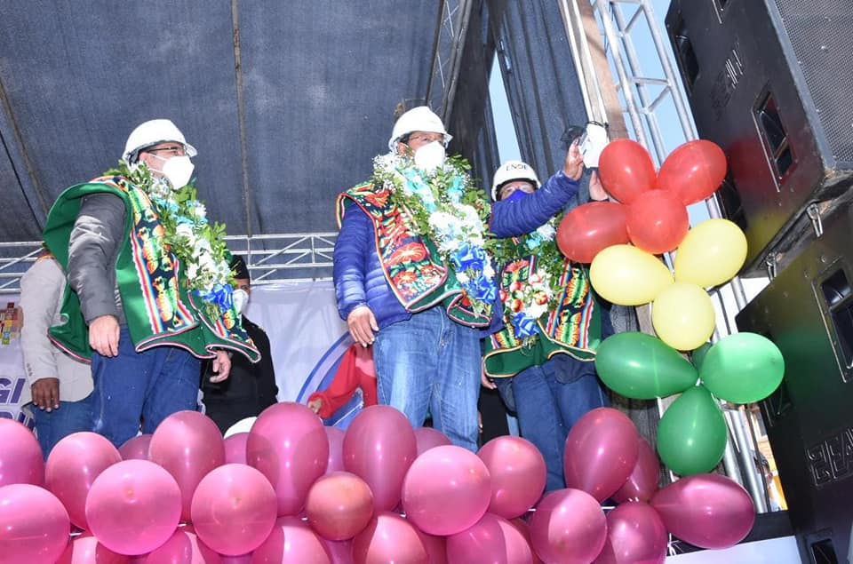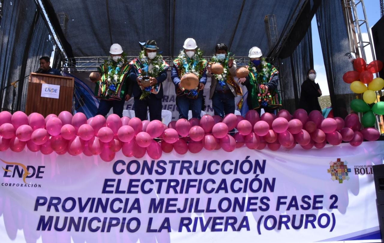 *UCOM-MHE-ENDE-03-02-2022.-* El presidente Luis Arce Catacora, el ministro de Hidrocarburos y Energías, Franklin Molina Ortiz, y autoridades del sector eléctrico inauguraron hoy el proyecto ‘Electrificación Provincia Mejillones Fase II – Municipio La Rivera (Oruro)’, que mejora la calidad de vida de 59 familias de esa población mediante el acceso al servicio básico de electricidad.
