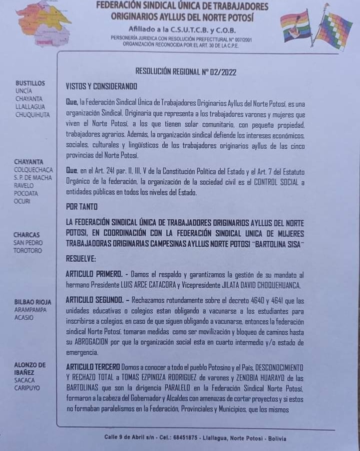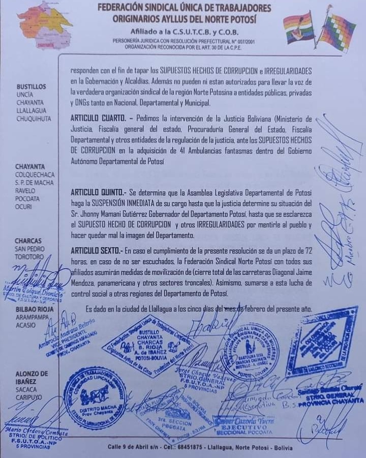 #Potosi La Federación de Campesinos del Norte de Potosí y Mujeres Campesinas Bartolina Sisa, exigen la suspensión del gobernador de #Potosí, Jhonny Mamani involucrado en la compra irregular de 41 ambulancias.