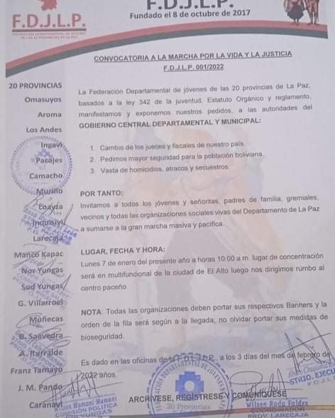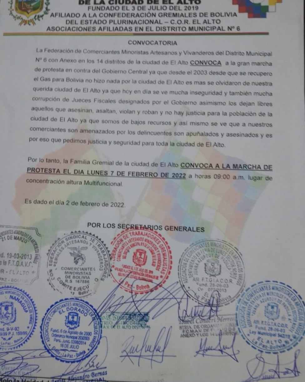 #ElAlto #Injusticia #Corrupcion Jóvenes de las 20 provincias del departamento de La Paz y la Federación de Comerciantes Minoristas marcharán este lunes 7 de febrero. Exigen el cambio de Jueces y Fiscales, además de Seguridad Ciudadana para la urbe alteña.