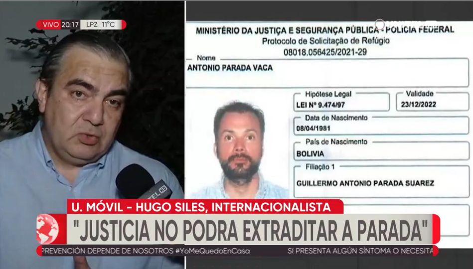 El internacionalista Hugo Siles señaló que el estatus de refugiado temporal que le habria otorgado Brasil a Antonio Parada impide su extradición a Bolivia y Brasil tampoco puede deportarlo.