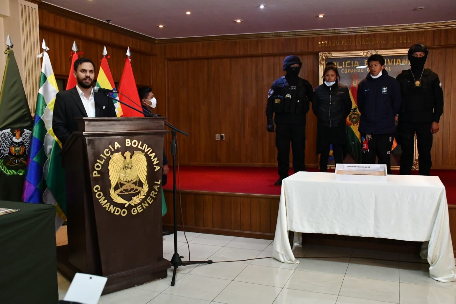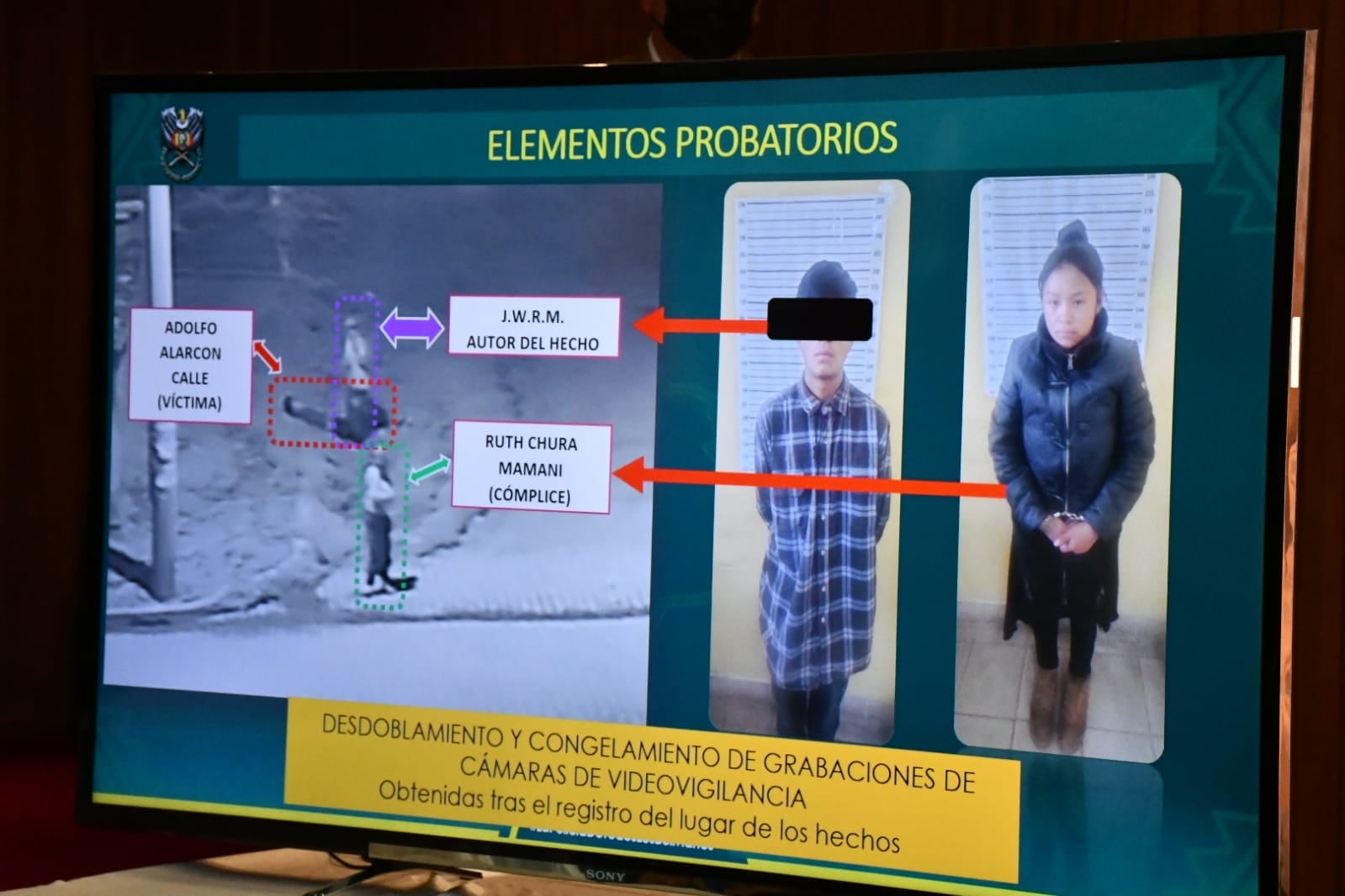 En conferencia de prensa el ministro de Gobierno, Eduardo Del Castillo, presentó el esclarecimiento de una caso de asesinato perpetuado en la ciudad de El Alto, donde un joven de 21 años de edad perdió la vida a causa de un atraco registrado mediante cámaras de seguridad. Pericias efectuadas por la Policía Boliviana lograron aprehender a los antisociales que efectuaron el ilícito y fueron presentados.