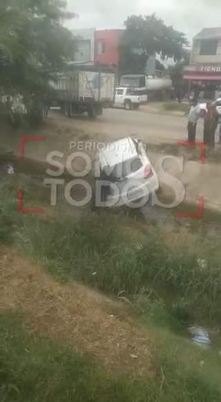 Caen dentro de un canal de drenaje, dos personas en supuesto estado de ebriedad, luego huyen del lugar encargando a otras personas que le ayuden a sacar el vehículo del fondo.