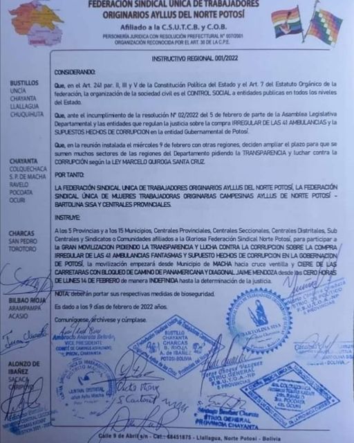#Potosí Ayllus anuncian bloqueo de la carretera Oruro – Potosí y de la Diagonal Jaime Mendoza (Llallagua – Sucre) desde hoy lunes 14 de febrero. Exigen transparencia e investigación del caso de corrupción #41AmbulanciasFantasmas que involucra al gobernador de Potosí, Johnny Mamani (#MAS)