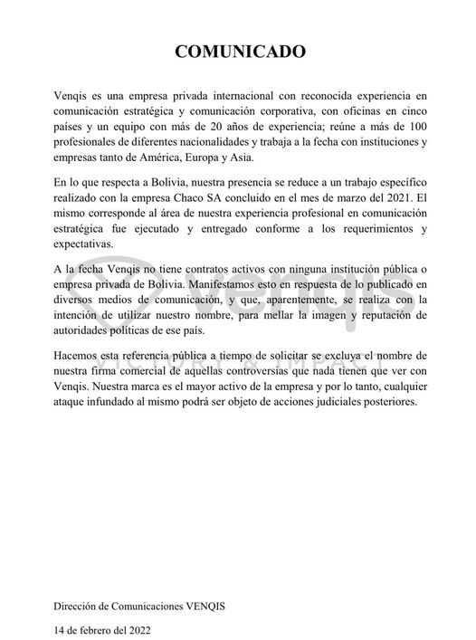 Venqis desde España señala que a la fecha no tiene ningún contrato con ningún estamento público del estado boliviano y que realizó un trabajo específico a la empresa Chaco S.A. que concluyó en el mes de marzo de 2021.