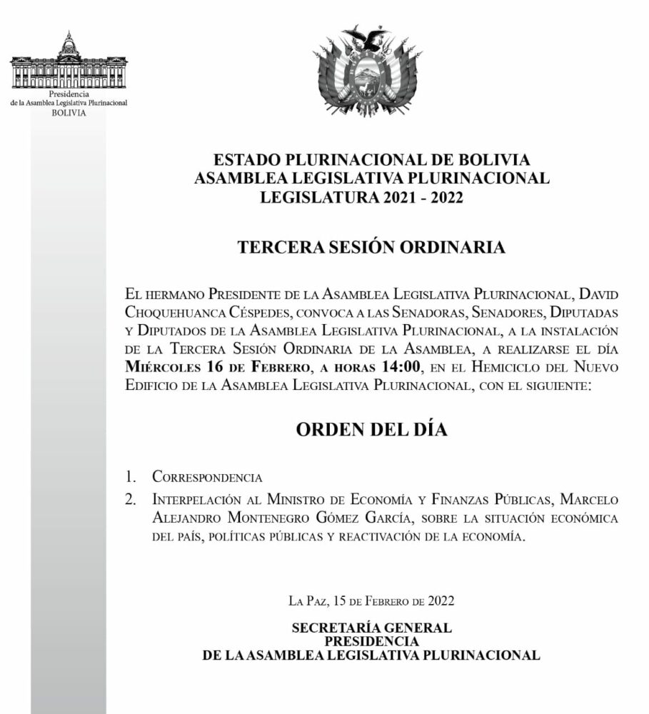 La sesión de interpelación está programada para las 14.00 de este miércoles. Entre otras consultas, Montenegro deberá informar sobre las políticas de redistribución de los recursos al pueblo boliviano, la reducción de los índices de pobreza luego del golpe de Estado y los resultados de las políticas gubernamentales para la reactivación económica.