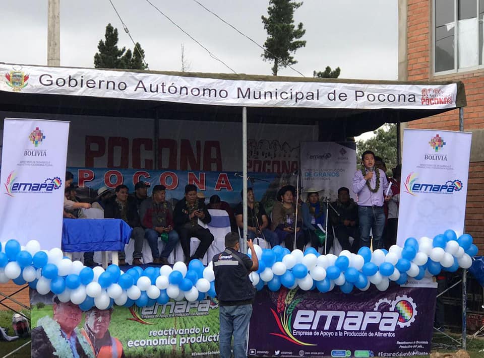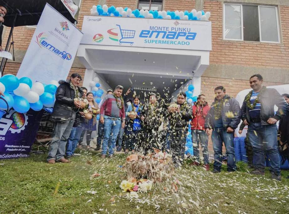EMAPA (Pocona, 15 de febrero) La Empresa de Apoyo a la Producción de Alimentos (EMAPA), empresa encabezada por Franklin Flores, inauguró un “Supermercado EMAPA” en la localidad de Monte Punku del municipio de Pocona en el departamento de Cochabamba. En la ocasión estuvieron presentes la responsable regional de #Cochabamba (EMAPA), María Elena Laura Andia, el Alcalde del Gobierno Autónomo Municipal de Pocona, Mario Rojas, concejales del municipio, el coordinador nacional de EMAPA, José Luis Quiroga, representantes de Federación Avícola y comunarios de la región.