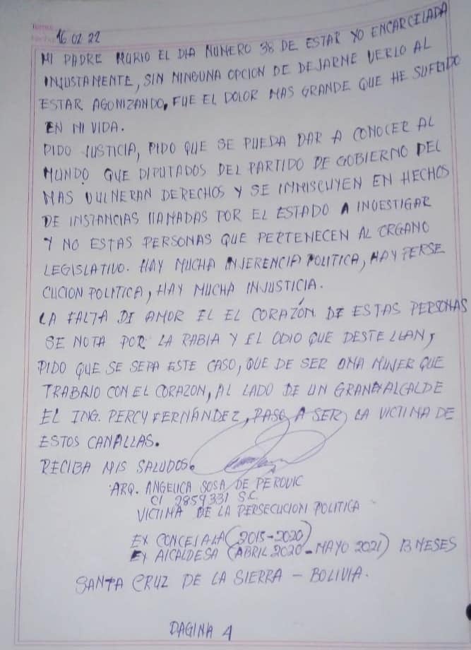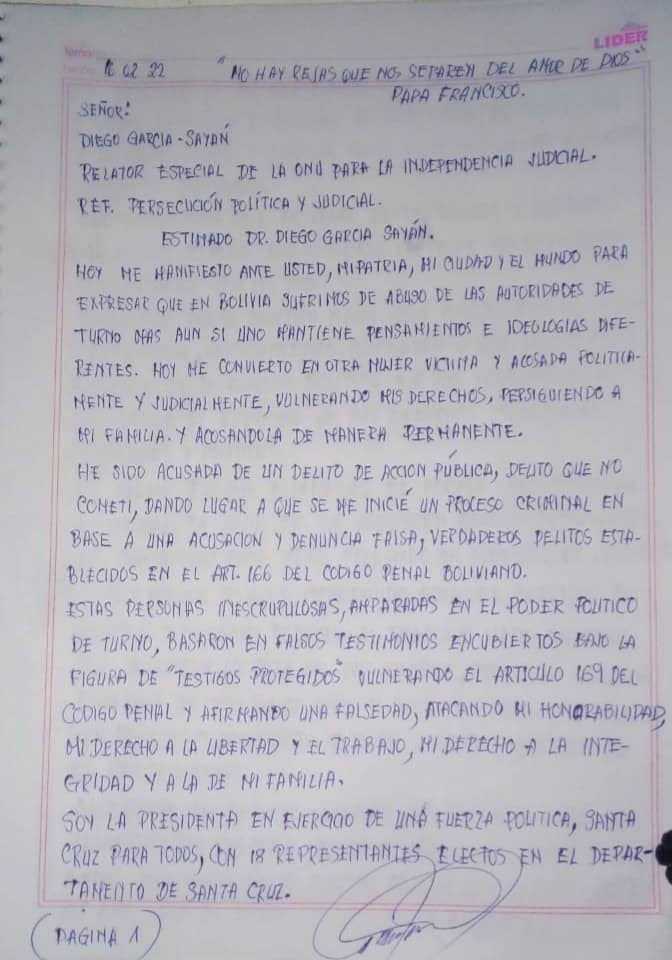 #ANF La exalcaldesa interina de #SantaCruz, Angélica Sosa, envió una carta al Relator Especial de la ONU, Diego García-Sayán, en la que denuncia vulneración de derechos y es afirma que es una presa política. pic.twitter.com/ODGSqrEZ0v