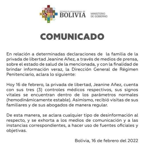 Ministerio de Gobierno sobre el estado de salud de la exmandataria #JeanineAñez #LibertadParaLosPresosPolíticos 🇧🇴