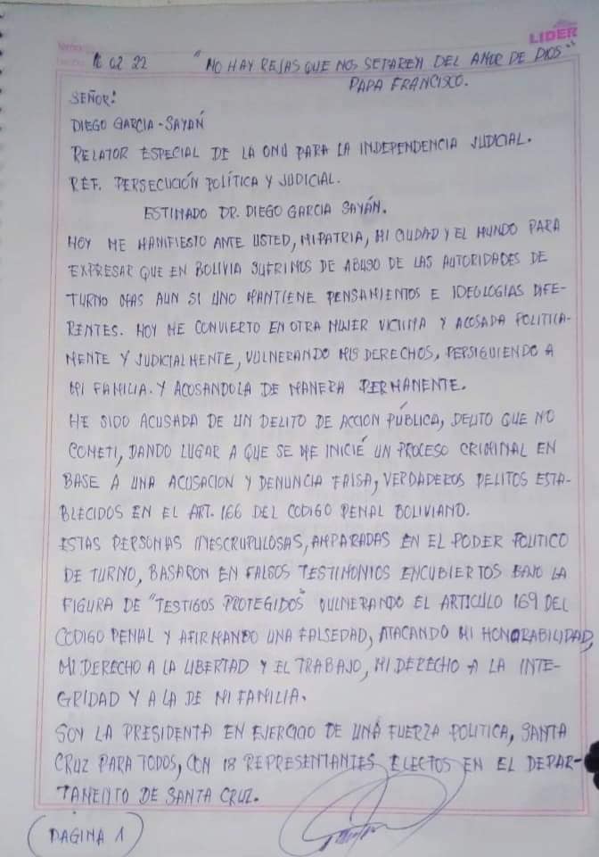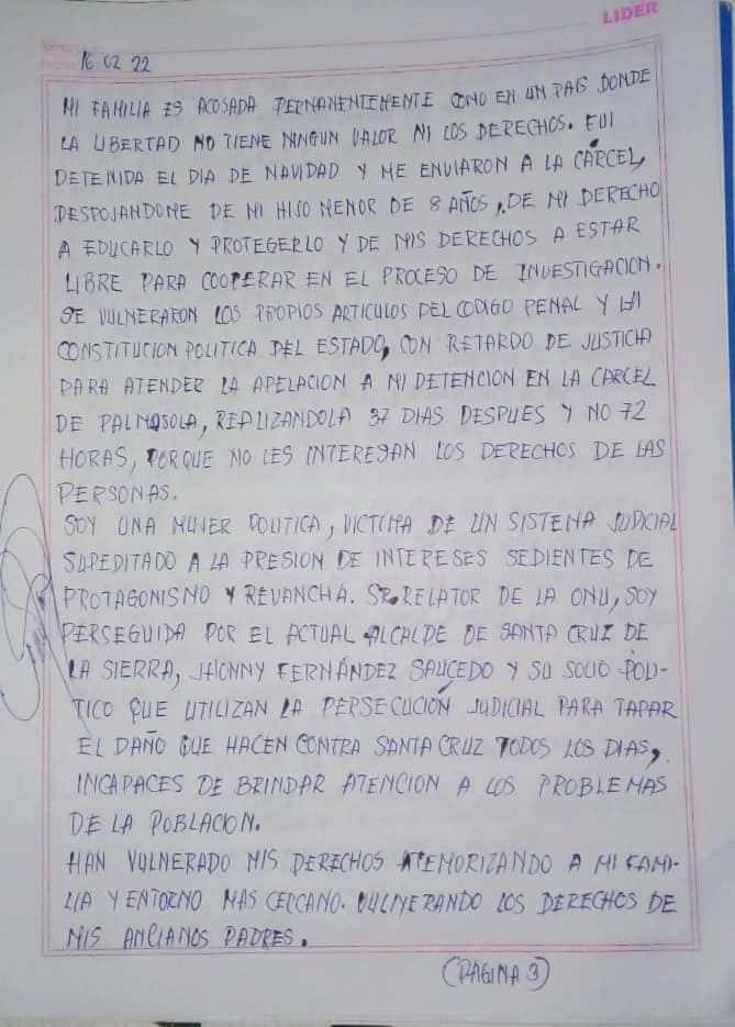 La exalcaldesa de Santa Cruz, Angélica Sosa, escribió una carta dirigida al relator de la ONU, Diego García-Sayán, donde denuncia vulneración de sus derechos y se declara perseguida política.