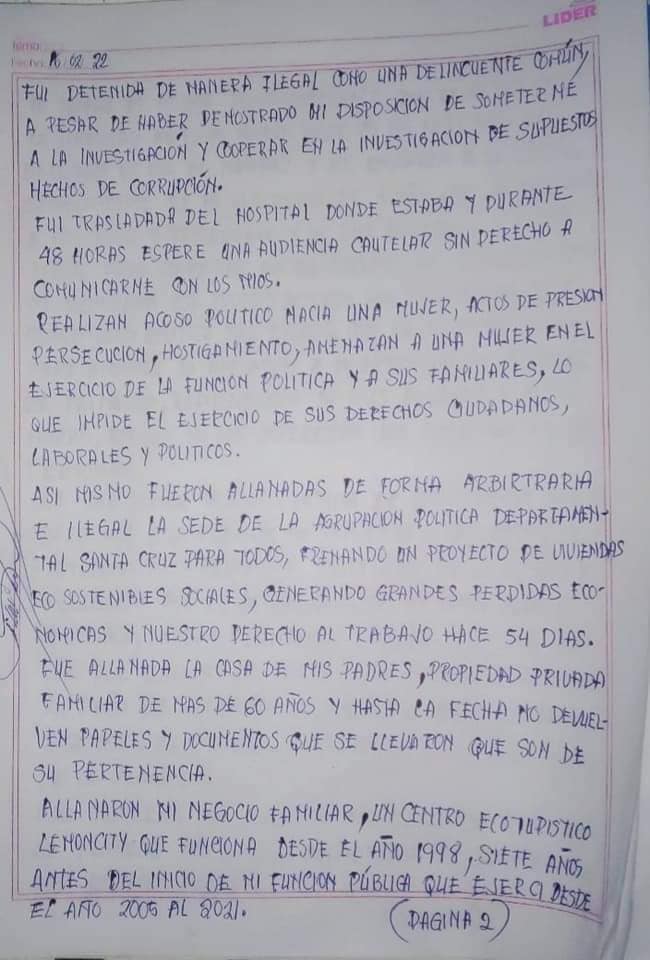«Realizan acoso político hacia una mujer, actos de persecución, hostigamiento, amenazan a una mujer en ejercicio de la función política y a sus familiares, lo que impide el ejercicio de sus derechos ciudadanos, laborales y políticos», señala Sosa en parte de la carta.