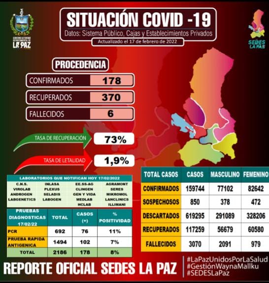 #ANF El departamento de #LaPaz suma 178 nuevos contagios, de los cuales 34 corresponden a #ElAlto, 119 a la sede de Gobierno y 25 a áreas rurales. Además, este jueves el Sedes reportó seis decesos. https://t.co/LuqV7BDUDO