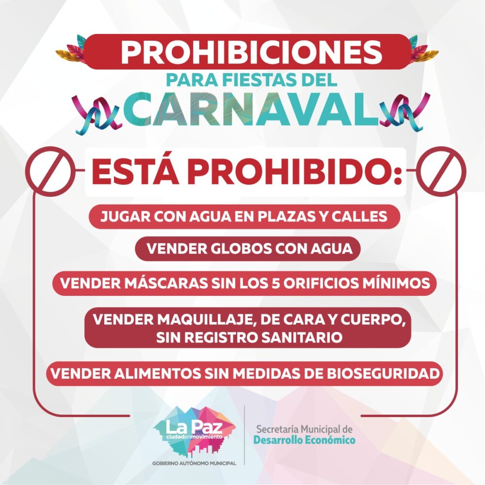 #ANF La Alcaldía paceña recuerda las prohibiciones dispuestas para la celebración del #Carnaval. https://t.co/pWZk33uHPv