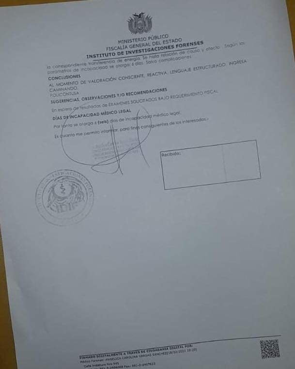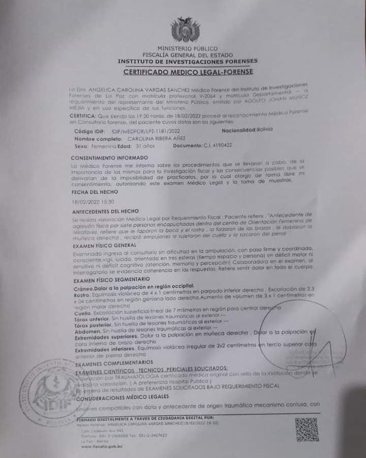 El #IDIF da 6 días de impedimento a #CarolinaRiberaÁñez, por las agresiones que sufrió hoy en el penal de Miraflores.