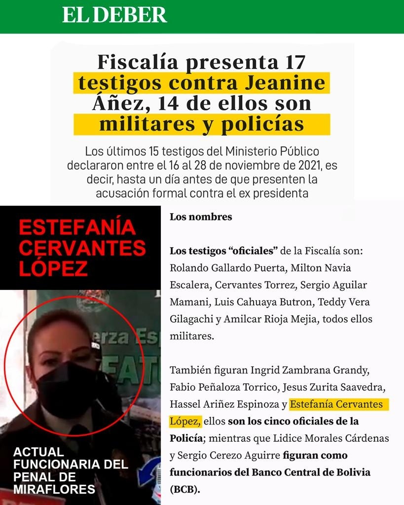 #Bunkeros denuncian que la funcionaria policial del penal de Miraflores que instruyó los abusos cometidos contra Carolina Ribera (6 días de impedimento-IDIF), forma parte de la lista de testigos contra #JeanineAñez
