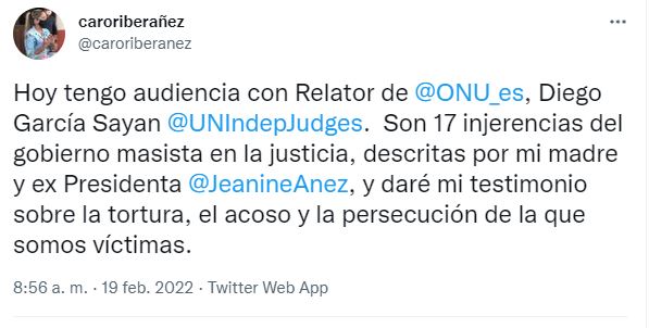 #ANF @caroriberanez , hija de la expresidenta Jeanine Áñez, informó que sostendrá una reunión este sábado con el Relator de la Organización de Naciones Unidas, Diego García-Sayán. https://t.co/104ah87V5c