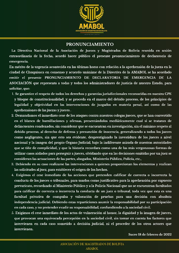 #ANF La Asociación de Magistrados de #Bolivia se declaró en estado de emergencia, exige que cese la vulneración a derechos en la aprehensión a jueces.