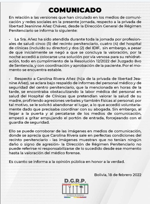 La Dirección General de Régimen Penitenciario informa que Jeanine Áñez fue atendida por profesionales de salud, anunciando que se encuentra estable; por otro lado, menciona que su hija al salir del centro no presentaba daños o signos de agresión y accedió a abandonar el lugar voluntariamente al obstaculizar la labor médica.