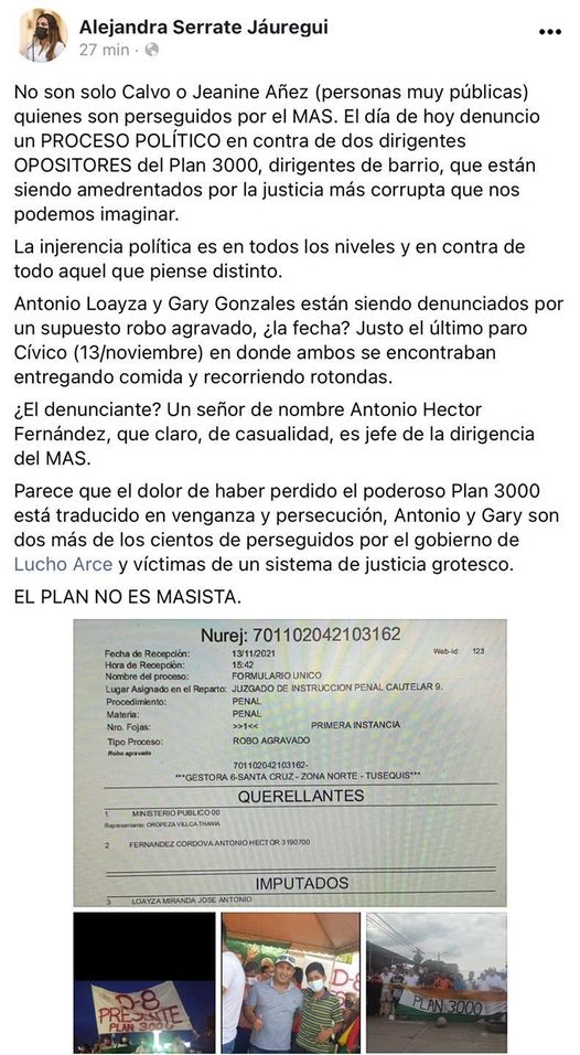 Serrate denuncia MAS procesos contra activistas