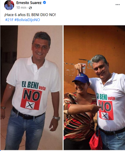 Hoy #21F el exprefecto de Beni, Ernesto Suárez, sacó su polerita recordando que ¡EL BENI D…