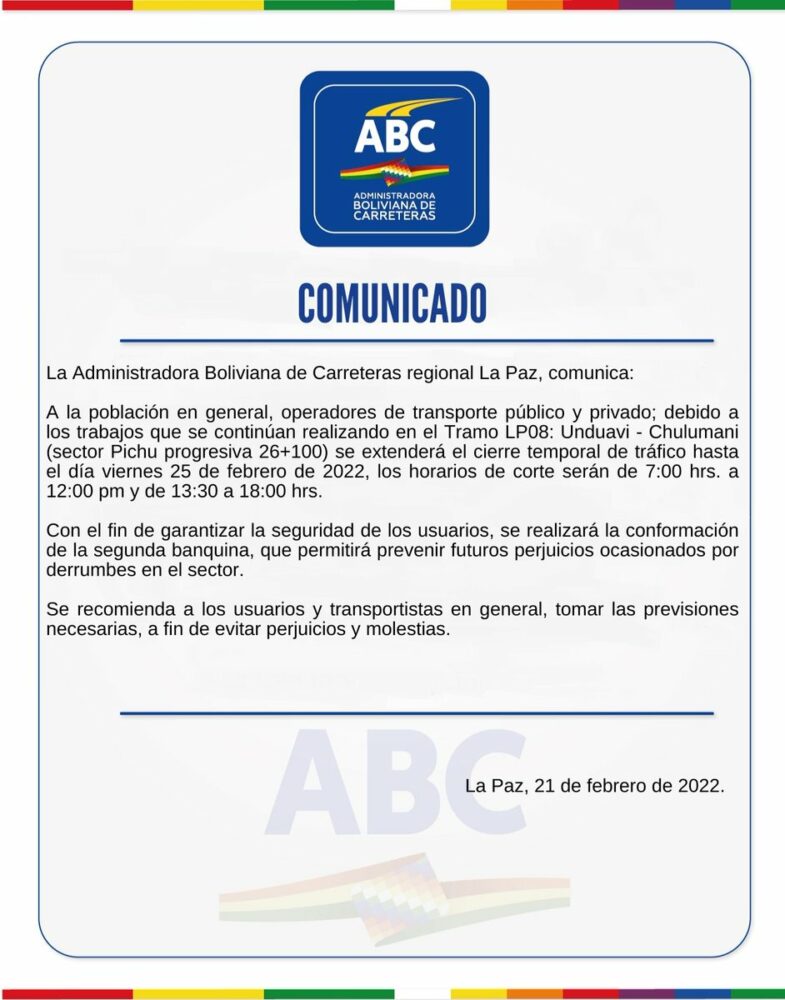#ANF Los Yungas: la @AdmCarreterasBo informa que los trabajos de limpieza en la carretera Unduavi – Chulumani continúan, por lo que el cierre de esta vía se extenderá hasta el 25 de febrero. https://t.co/1XFEhhZxqB