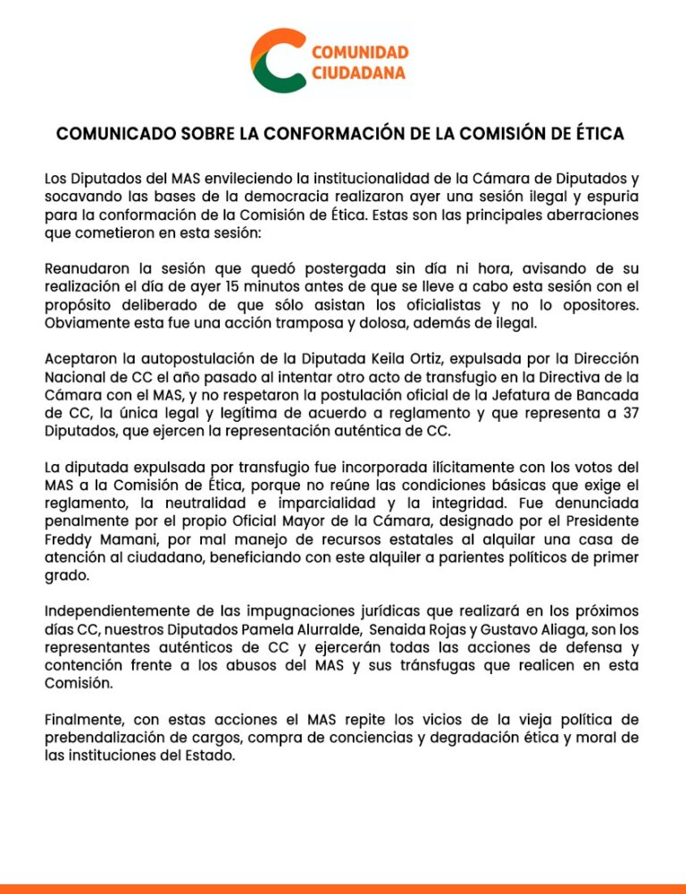 #ANF @ComunidadCBo denuncia que diputados del MAS aceptaron la autopostulación de Keila Ortiz, «expulsada por la dirección nacional de CC por intentar otro acto de transfugio». «Esta fue incorporada ilícitamente con votos del MAS a la Comisión de Ética», cita el comunicado. https://t.co/ynwhqvRZoM