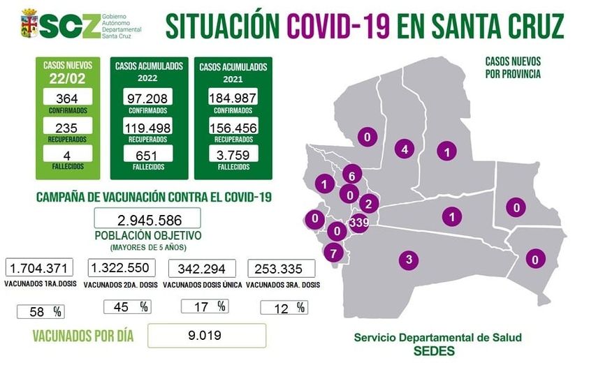 #SCZ hoy reportó 364 nuevos contagios de #covid-19 y 4 fallecidosCategorías NoticiasEtiquetas , Agustín Zambrana en El Bunker, Facebook 22/02/2022 #SCZ hoy reportó 364 nuevos contagios de #covid-19 y 4 fallecidos Fuente: Agustín Zambrana en El Bunker => Recibir por Whatsapp las noticias destacadas