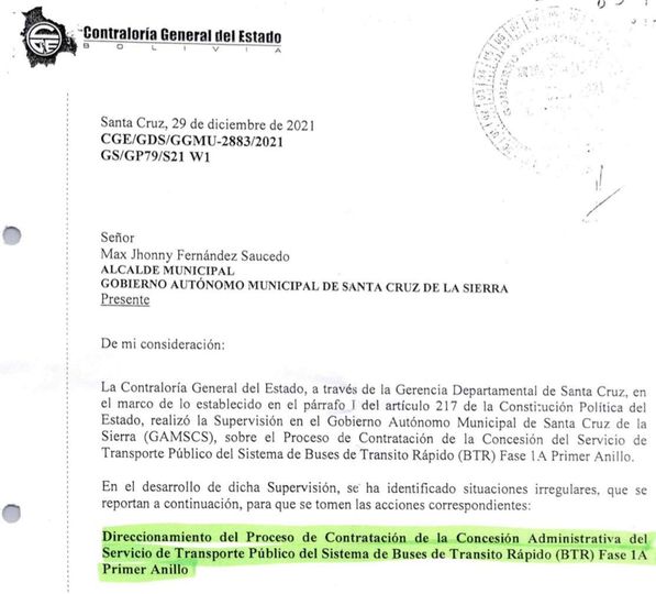 El 29 de diciembre 2021, la Contraloría señaló al municipio cruceño que el proceso de contratación de concesión de administración dem BTR tiene “situaciones irregulares” y que hubo “direccionamiento en el proceso de contratación de la concesión administrativa”.