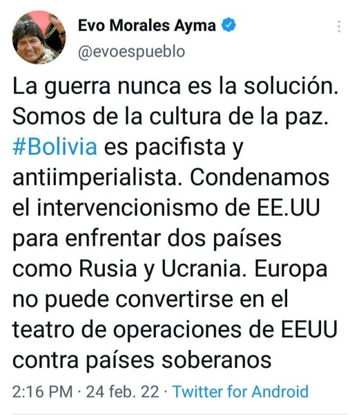 Evo:»Condenamos el intervencionismo de EEUU para enfrentar dos países como Rusia y Ucrania»