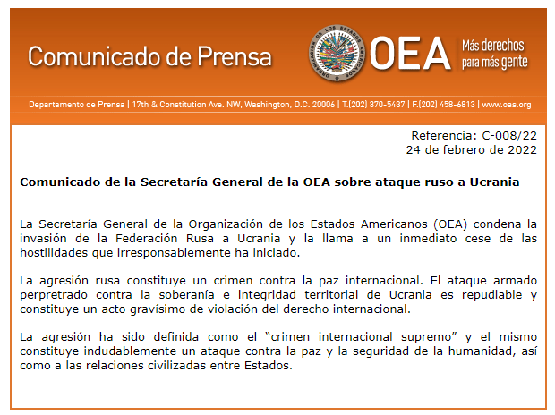 #Ultimo La Secretaría General de la @OEA_oficial emite un comunicado sobre el ataque de #Rusia a #Ucrania. "La agresión rusa constituye un crimen contra la paz internacional", cita la nota. pic.twitter.com/H9wFrZxiuK