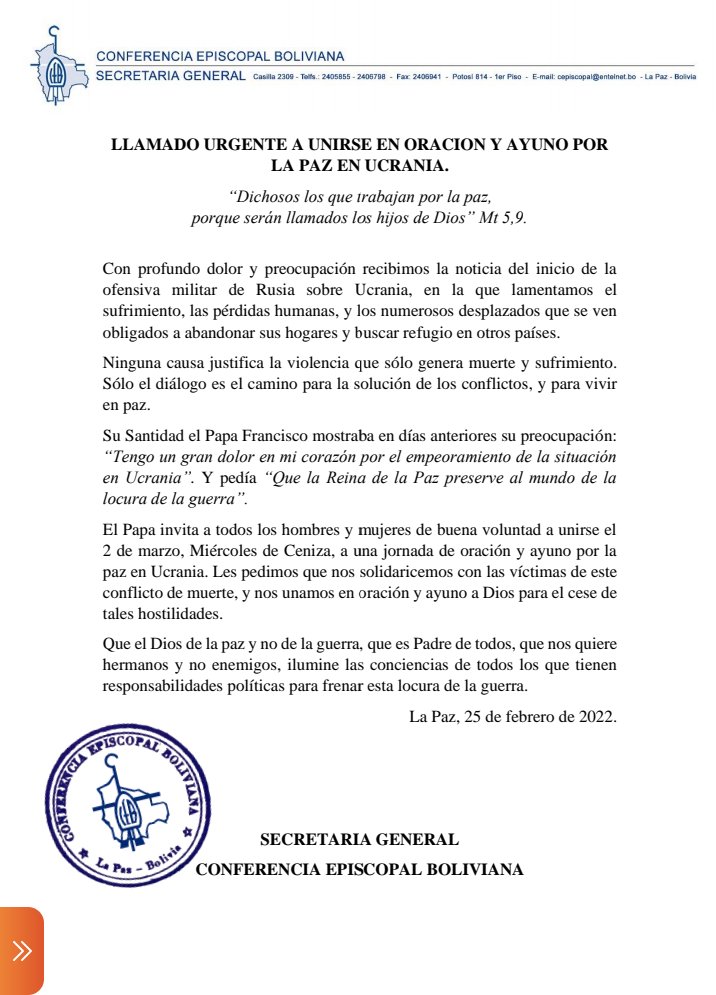 #ANF La Conferencia Episcopal Boliviana (CEB) hace un llamado para unirse a la jornada de oración y ayuno, convocado por el Papa Francisco para el 2 de marzo, por la paz en #Ucrania. «Ninguna causa justifica la violencia que solo genera muerte y sufrimiento», cita el comunicado. https://t.co/UBbyujwiE0