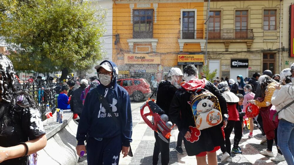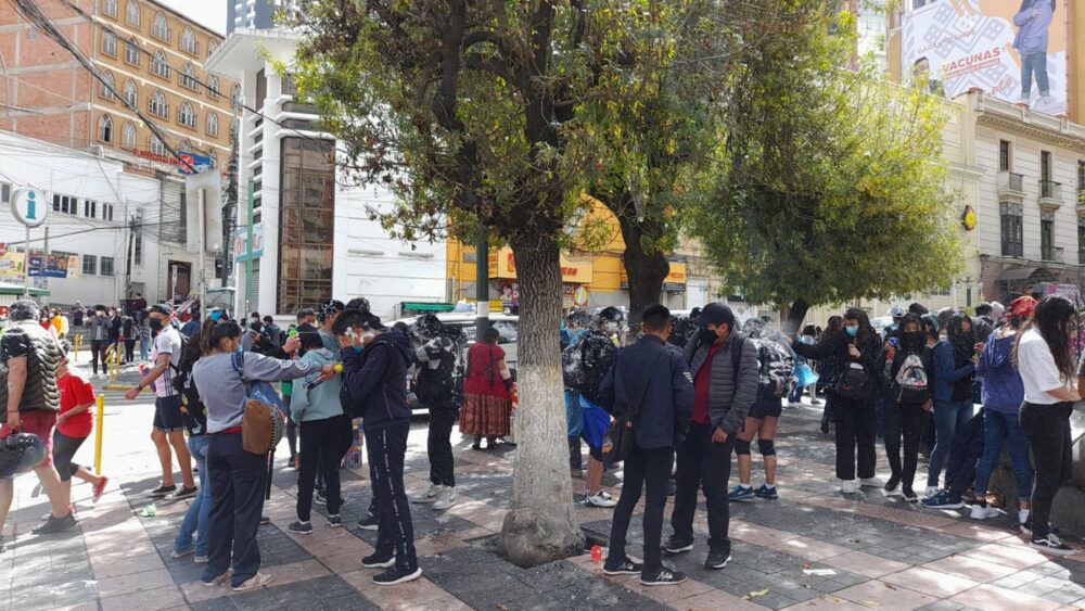 #ANF A pesar de la suspensión del Corso Infantil y la Farándula Carnavalera en La Paz, grupos de jóvenes y adolescentes se reunieron en el Prado para jugar con agua y espuma.