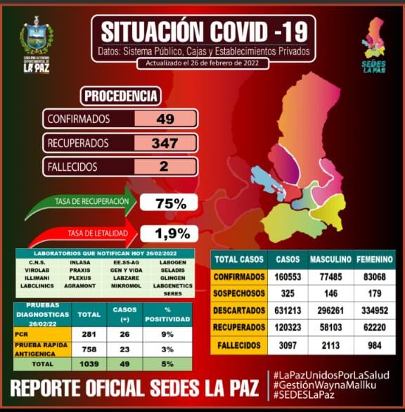 #ANF El Servicio Departamental de Salud de La Paz reportó este sábado 49 casos de positivos de #COVID19, dos fallecidos y 347 recuperados. https://t.co/AIy4RfXoTk