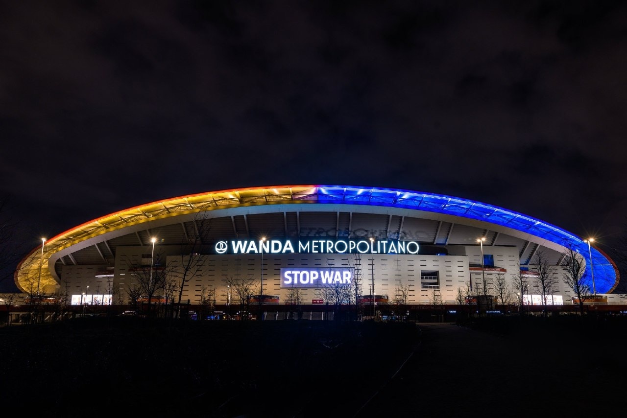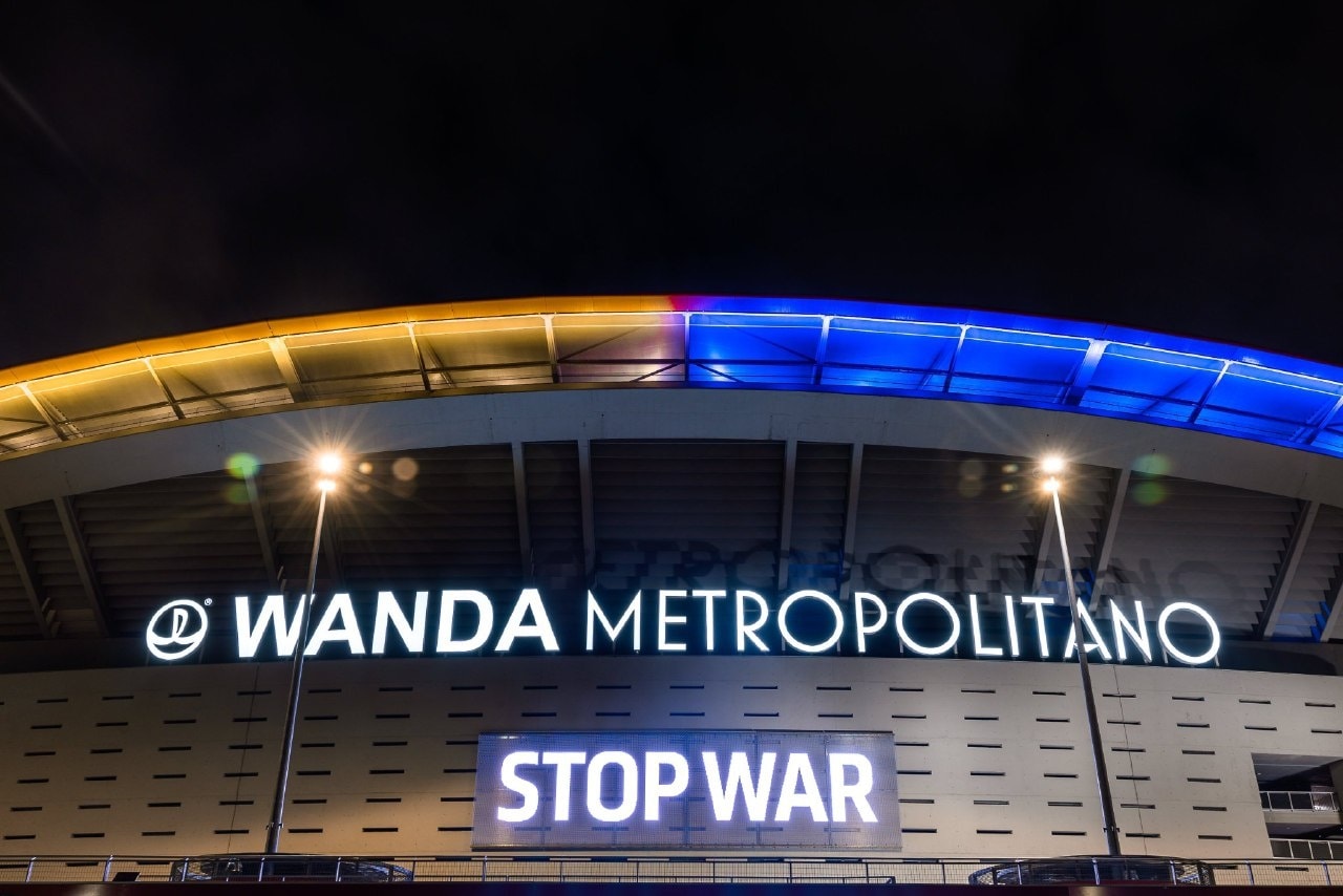 🏟🇺🇦 | El Wanda Metropolitano también se tiñe con los colores de la bandera ucraniana junto al lema ‘Stop War’. ❗️Además, ‘LaLiga’ informó que se mostrará el mensaje ‘No a la guerra’ en todos los partidos de Primera y Segunda durante esta jornada.
