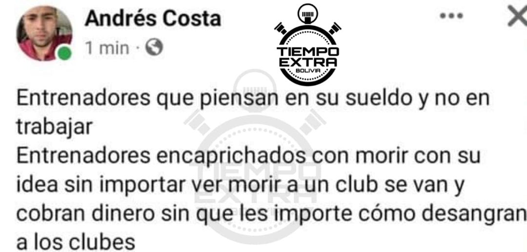 Andrés Costa, presidente de Always Ready, se expresó de manera explosiva en sus redes sociales después de la derrota ante Bolívar. Señaló que hay entrenadores que sólo piensan en lo económico, no en su club. La publicación fue borrada minutos después de haber sido difundida.