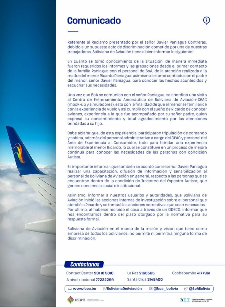 #ANF Boliviana de Aviación (BoA) informó que investigan la denuncia sobre presunta discriminación a una persona autista y que asumirán acciones «correctivas» pic.twitter.com/rT4JD1SfNG