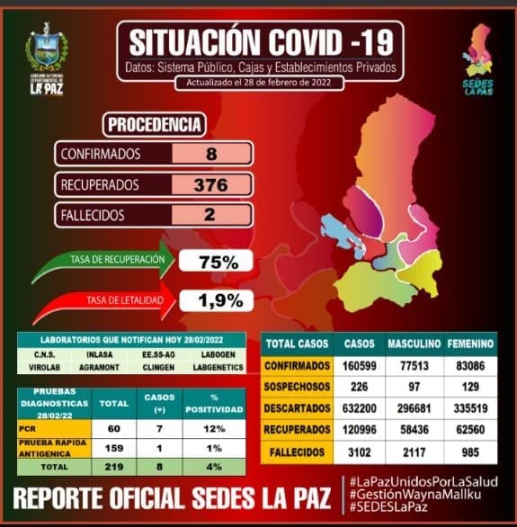 #ANF El Servicio Departamental de Salud de La Paz reportó este lunes 8 casos positivos de #COVID19, dos fallecidos y 376 personas vencieron al virus. pic.twitter.com/Ll40d1JnXC