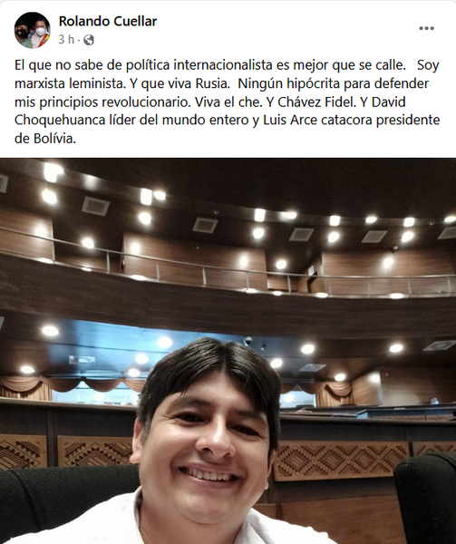 «Soy marxista leminista. Y que viva Rusia. Ningún hipócrita para defender mis principios revolucionario. Viva el Che. Y Chávez Fidel. Y David Choquehuanca líder del mundo entero y Luis Arce catacora presidente de Bolívia», escribió en sus redes sociales.