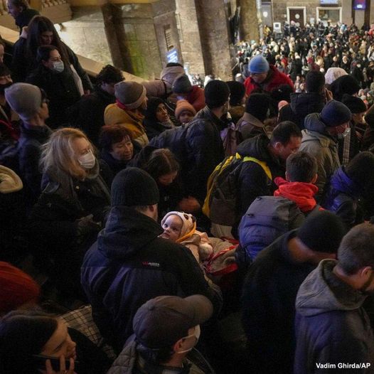 Foto de bebé en brazos en Ucrania se vuelve viral Un hombre carga a un bebé mientras la gente lucha en las escaleras después de un cambio de última hora en la plataforma de salida de un tren con destino a Lviv en Kiev, Ucrania 🇺🇦.