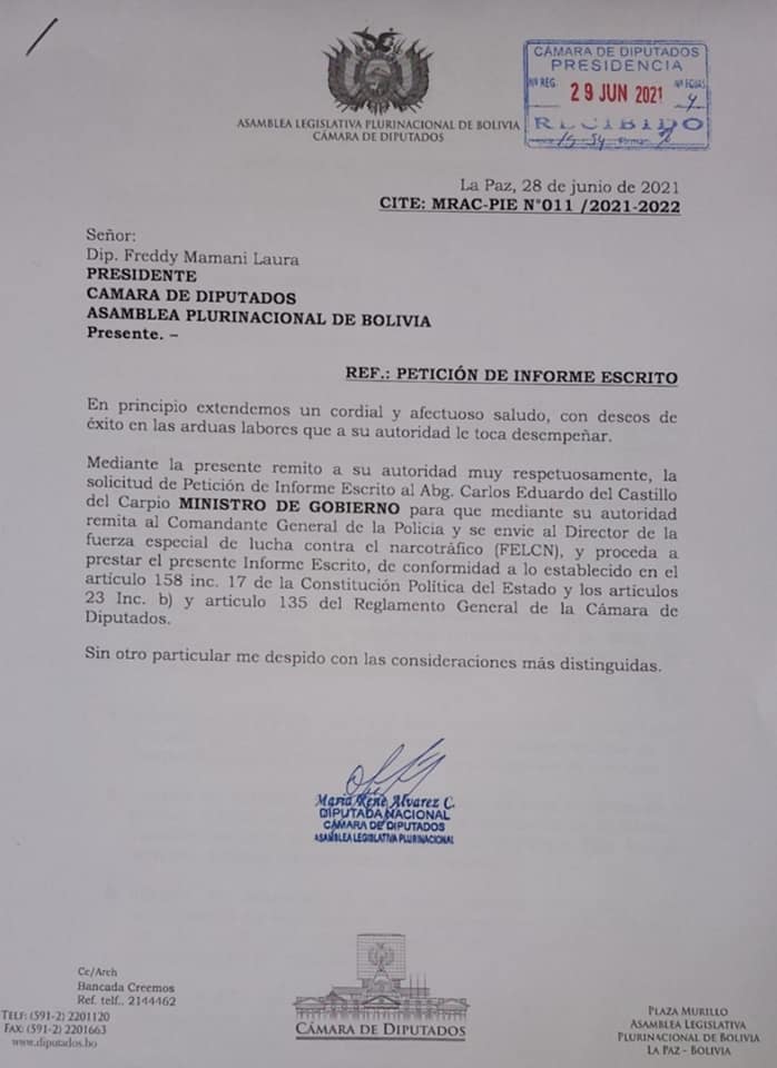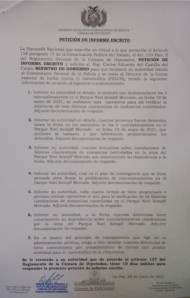 La diputada de la alianza #Creemos, María René Álvarez señaló que meses atrás alertó sobre la existencia de actividad de narcotráfico en el #ParqueNoelKempff al Ministro de Gobierno, Eduardo del Castillo y solicitó una Petición de Informe Escrito (PIE) sobre el caso, sin embargo, este «no hizo nada».