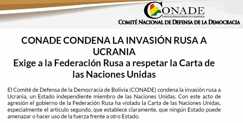 #ANF El @CONADEbo condena la invasión rusa a #Ucrania y manifiesta que #Rusia violó la Carta de las Naciones Unidas. «No existe ninguna justificación de índole jurídica, política o de seguridad nacional para iniciar la ocupación de territorios ajenos», cita su pronunciamiento. https://t.co/P22oDmQBSX