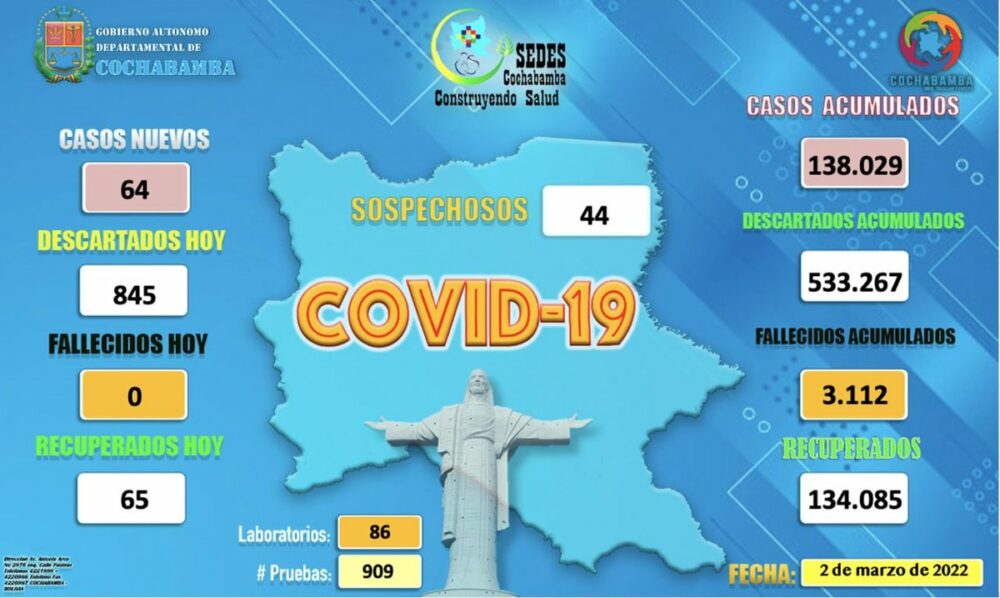#ANF En #Cochabamba 64 personas dieron positivo para #COVID19 y 65 se recuperaron. pic.twitter.com/bcfGcyYYLJ