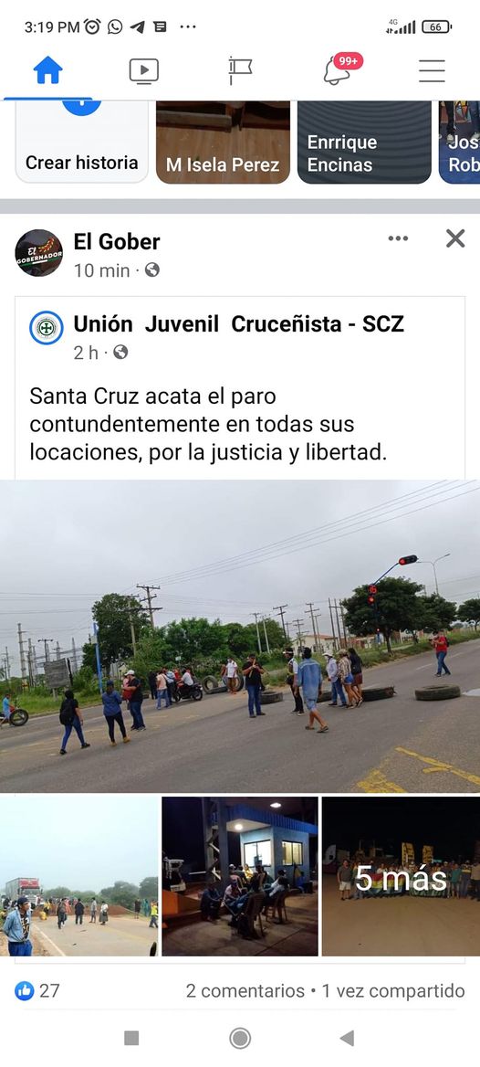 El Gober (Camacho) y la unión juvenil Cruceñista , aseguran en sus cuentas de redes sociales que el paro fue todo un éxito, y muestran sus puntos de bloqueo.