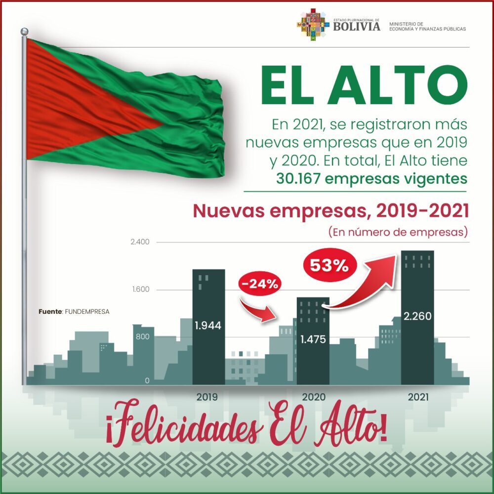 Debido al proceso de reconstrucción y reactivación de la economía, en la urbe alteña, el año 2021 nacieron 2.260 unidades productivas, lo que muestra un crecimiento del 53% a las 1.475 firmas creadas en 2020, refiere un reporte del Ministerio de Economía.