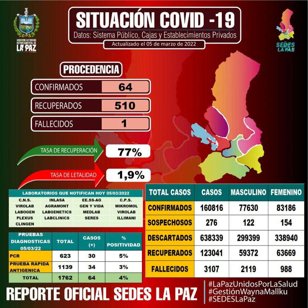 #ANF El Sedes La Paz reporta hoy 64 nuevos contagios de Covid-19 y un deceso. https://t.co/JOQ16GV58Y