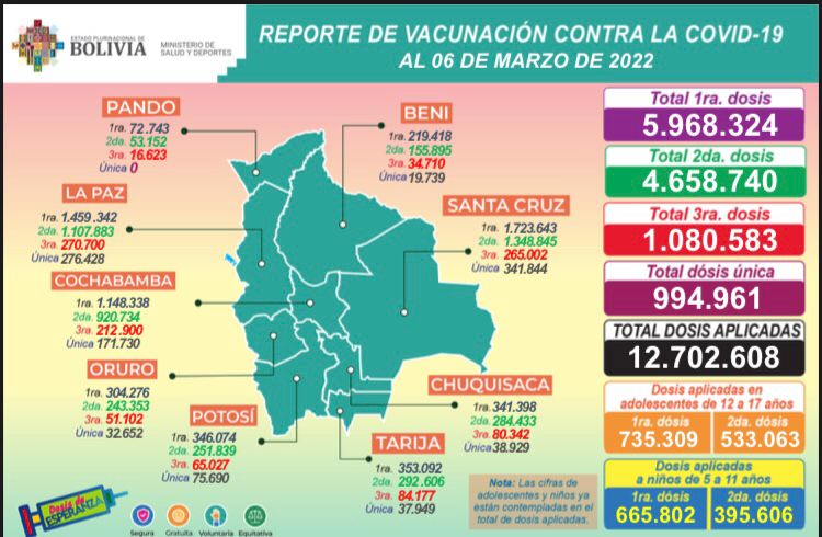 #ANF El Ministerio de Salud y Deportes informa que a la fecha se aplicaron 12.702.608 dosis de la vacuna contra el Covid-19 en #Bolivia. pic.twitter.com/0dXz761jIK
